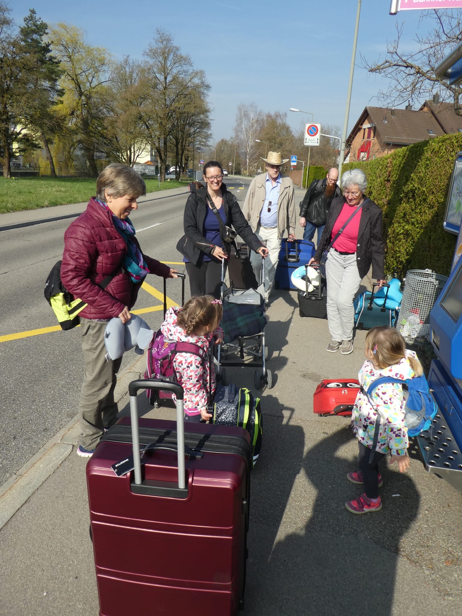 Den Transport von sechs grossen Koffern, einem Buggy, drei Handgepäckkoffern, vier Rucksäcken, einer Notebooktasche, einer Kamaratasche und zwei kleinen Flöhen mussten wir genau überlegen. Schlussendlich sind wir in Begleitung unserer Gross-/Eltern mit dem ÖV an den Flughafen Zürich gefahren.